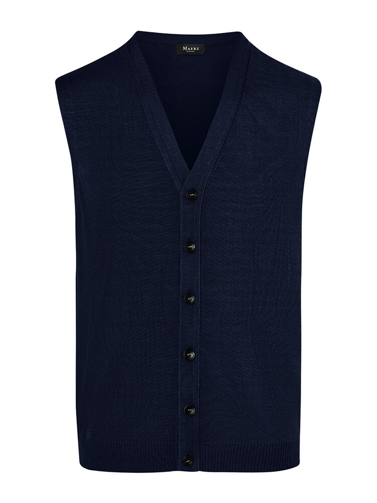 Zu jeder Jahreszeit, sorgt der überaus stilvolle MAERZ Weste an kühleren Abenden oder Tagen für ein angenehmen Tragekomfort. Dieser unifarbene Weste in der Farbe marine aus 100% Merinowolle mit eleganten V-Auschnitt ergänzt Ihren Kleiderschrank und unterstreicht ihre maskuline Silhouette. Ob in der Freizeit oder im Büro der Wohlfühlfaktor ist mit diesem leicht taillierten Pullover aus dem Hause MAERZ garantiert.Herstellerinformation: