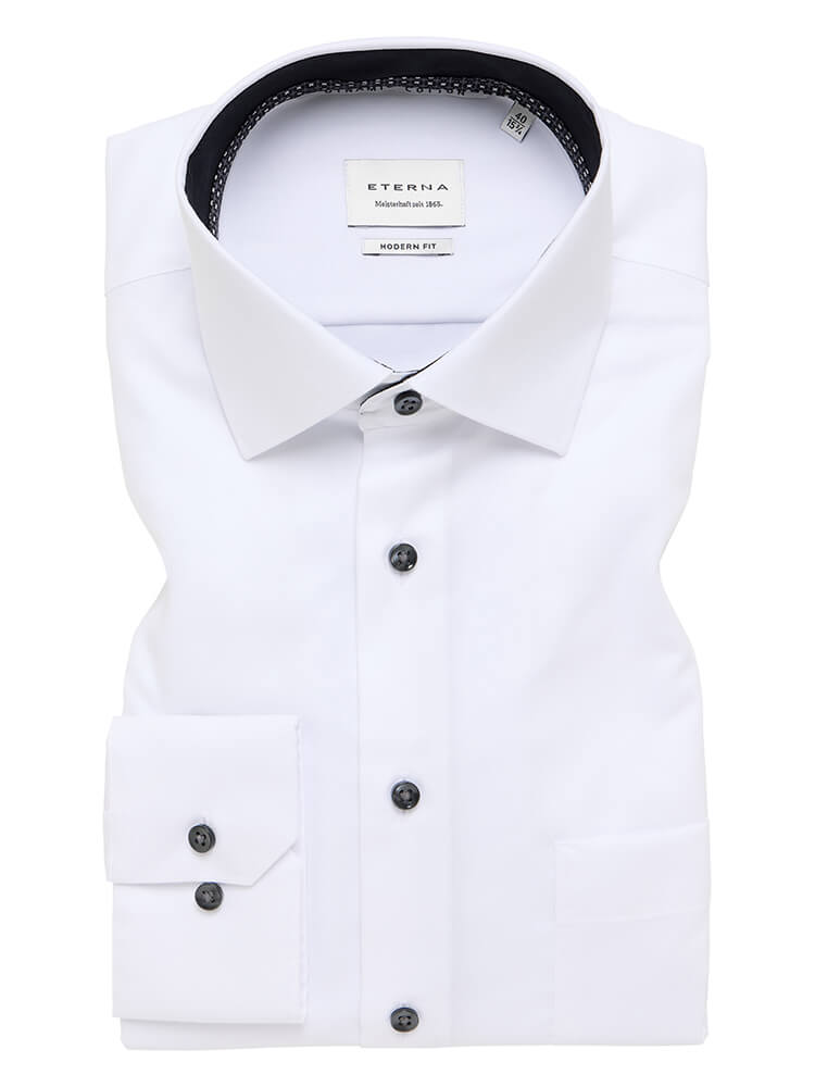 Das moderne Businesshemd aus der ETERNA Modern Fit Kollektion steht für den selbstbewussten und modischen Mann von heute. Ein zeitgemäßer Schnitt verbunden mit erstklassigen Produktdetails verspricht einen hohen Komfort und macht dieses Hemd zu einem Meister des Arrangements. Das unifarbene Herrenhemd in der Farbe weiß darf in keiner Herrengarderobe fehlen und kann mit dem vornehmen und klassischen Kent Kragen zu jedem Anlass sowie im Alltag getragen werden. Mit einer passenden Krawatte und einem großen Krawattenknoten kommt dieses ETERNA Modern Fit Herrenhemd am besten zur Geltung.