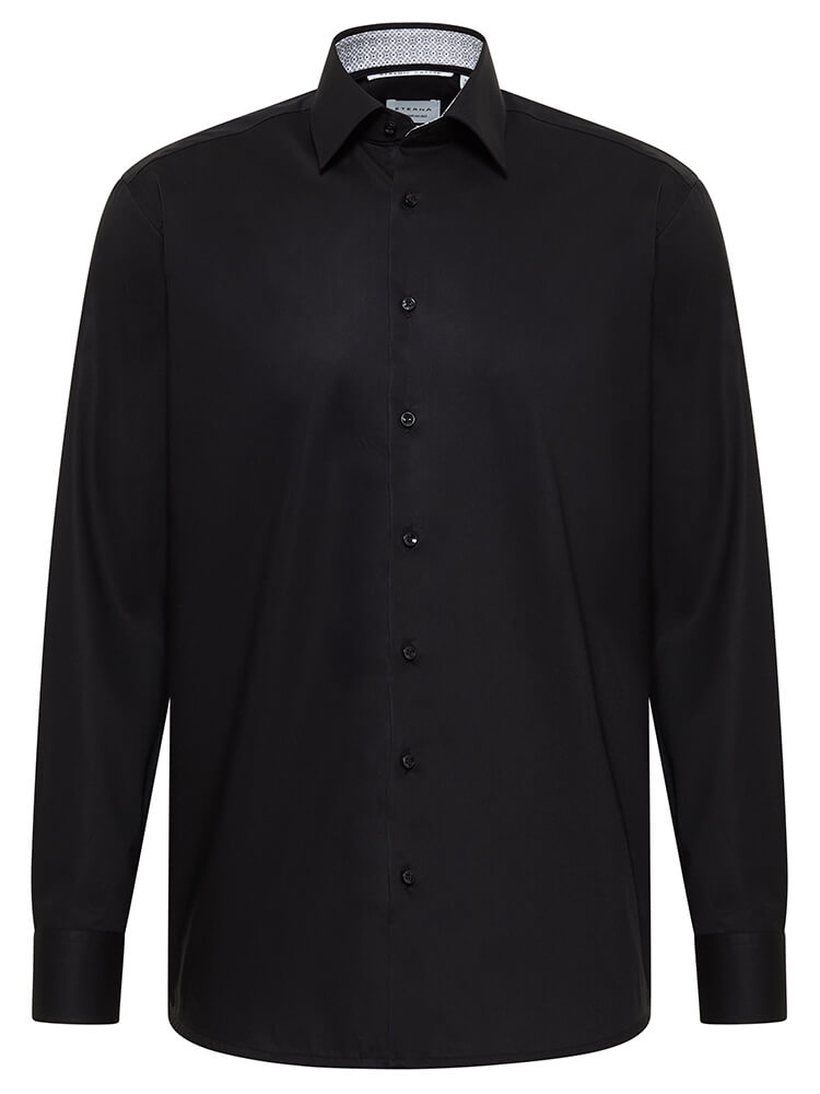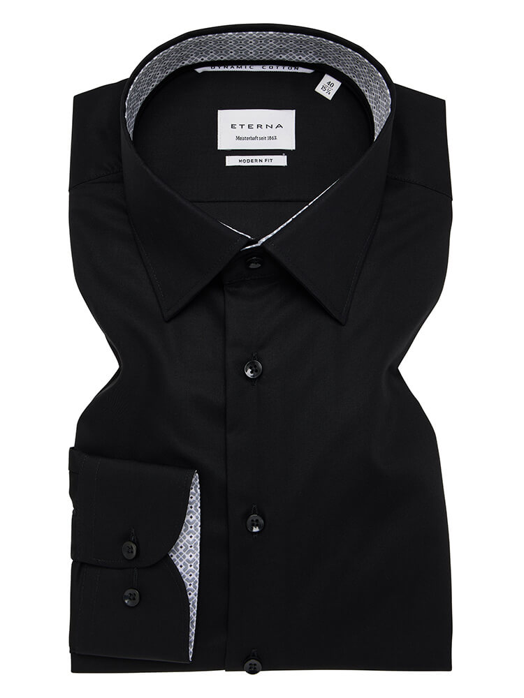 The modern business shirt from the ETERNA Modern Fit collection stands for the confident and fashionable man of today. A contemporary cut combined with first-class product details promises a high level of comfort and makes this shirt a master of arrangement. The plain men's shirt in the colour black should not be missing from any man's wardrobe and can be worn with the distinguished and classic Kent collar for any occasion as well as in everyday life. This ETERNA Modern Fit men's shirt looks best with a matching tie and a large wide knot.