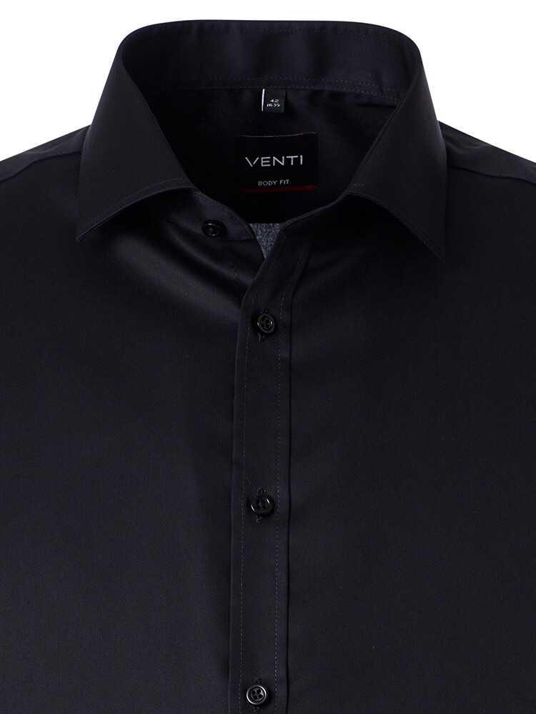 Het elegante business overhemd uit de VENTI Body Fit collectie staat voor de slanke, modebewuste man van vandaag. Een slanke pasvorm gecombineerd met modieuze details beloven een hoog draagcomfort en maken van dit overhemd een combinatiekunstenaar. Het effen overhemd in de kleur zwart overhemd voor heren mag in geen enkele mannengarderobe ontbreken en kan met de elegante en tijdloze Kent kraag zowel voor elke gelegenheid als in het dagelijks leven worden gedragen. Dit VENTI Body Fit herenoverhemd komt het beste tot zijn recht met een smalle stropdas en een kleine dasknoop.